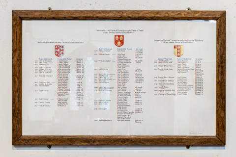 A historical listing of former Rectors (priests) can be found near the south porch. From 1409-1632 the church was served by eight successive members of the Langley family from Agecroft. This is believed to be the longest uninterrupted ministry by one family in the Church of England. Near the organ you will find an impressive marble memorial to Rev James Lyon, rector for 53 years from 1783. Priests are ordained to lead God’s people in the offering of praise, the proclamation of the gospel and the ministry of the sacraments.